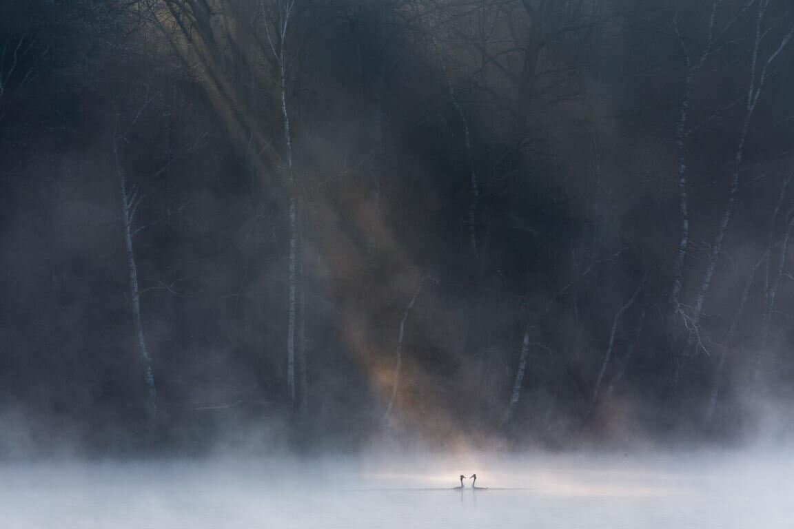 Een paartje futen, dat juist op het punt staat een paringsbalts uit te voeren. De mist boven het water en de donkere bomen op de achtergrond zorgen voor een sprookjesachtig geheel. De foto won in de categorie Wildlife bij de Hasselblad Masters. “Bij zo’n foto moet je geluk hebben,” vertelt fotograaf David Peskens. “Hier kwam alles bij elkaar: het paartje futen, de mist boven het water en zonnestralen die tussen de donkere bomen door schijnen. Zo ontstaat een mystiek beeld.”