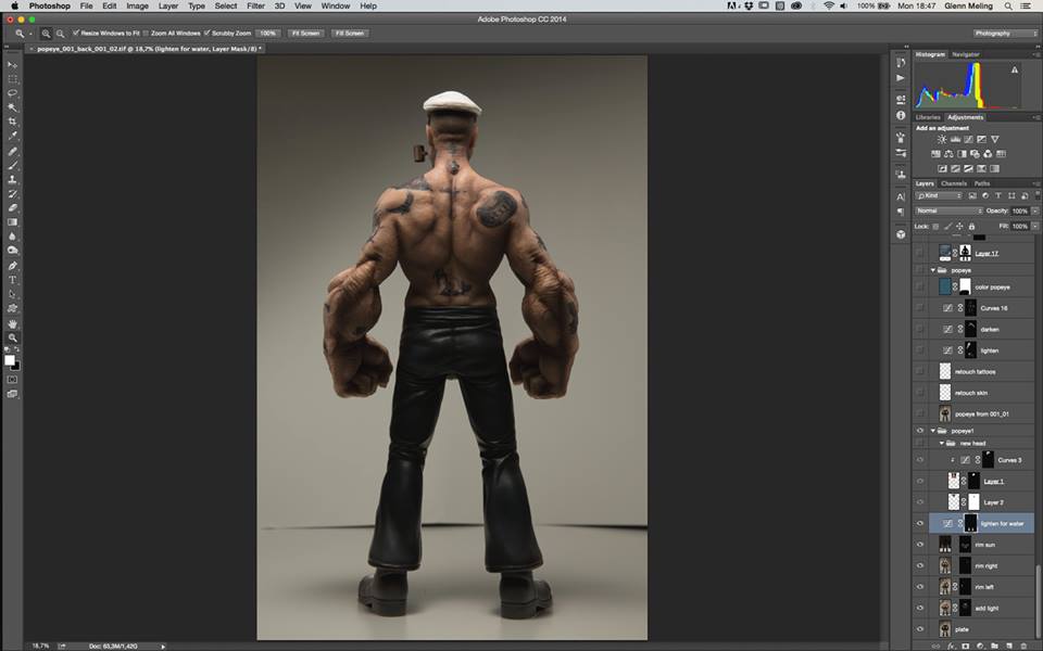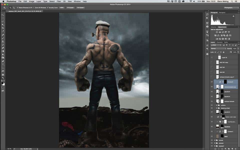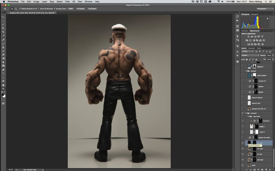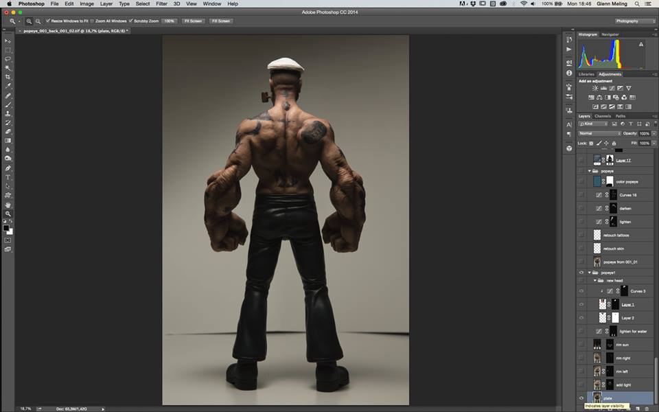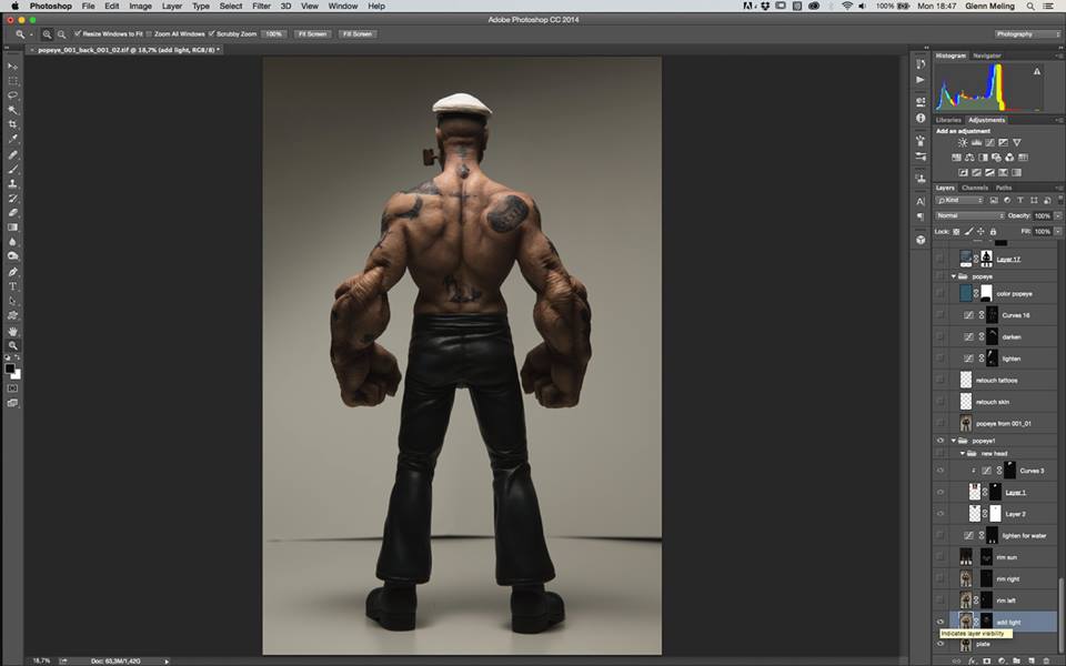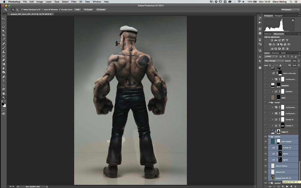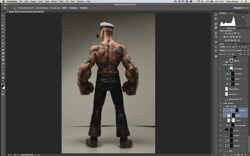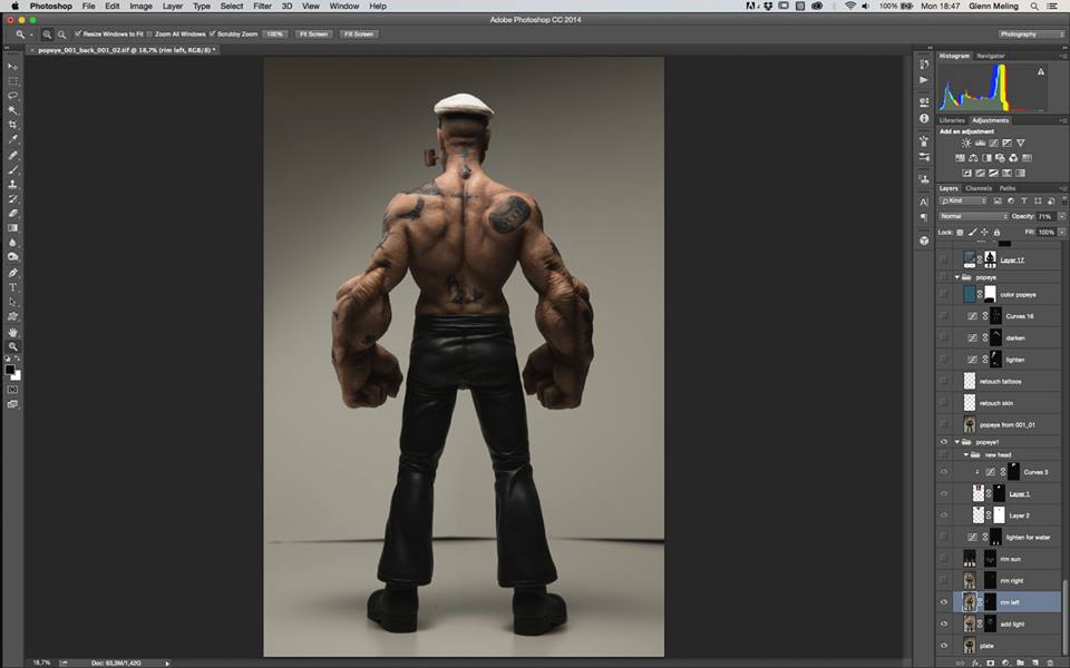 De Noorse fotograaf Glenn Meling laat op zijn Facebookpagina zien hoe hij stap voor stap een filmposter maakt. Zijn startpunt is een pop van Popeye. Door te spelen met verschillende achtergronden, creëert hij een aansprekende poster.