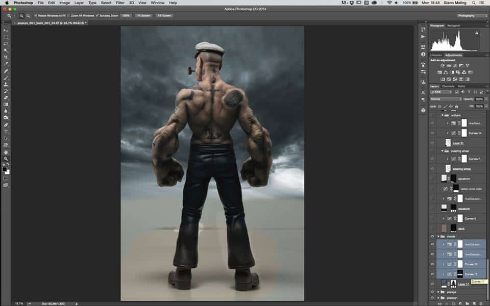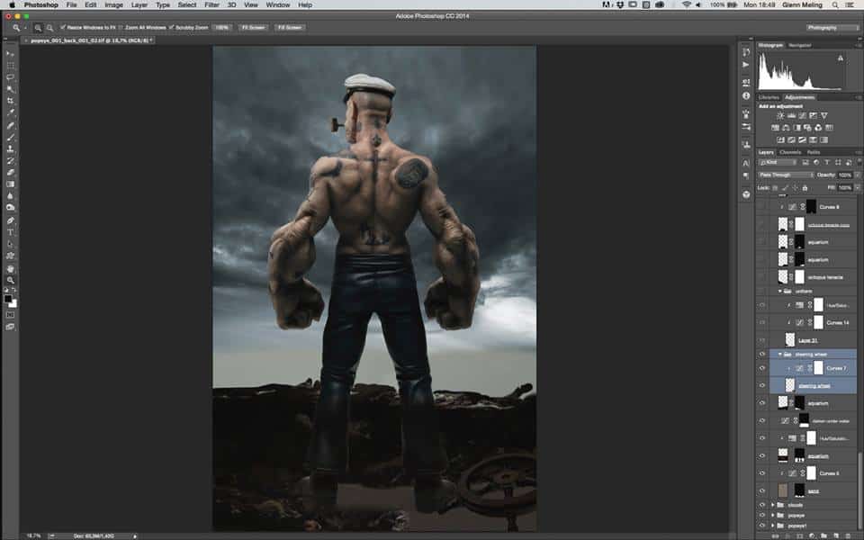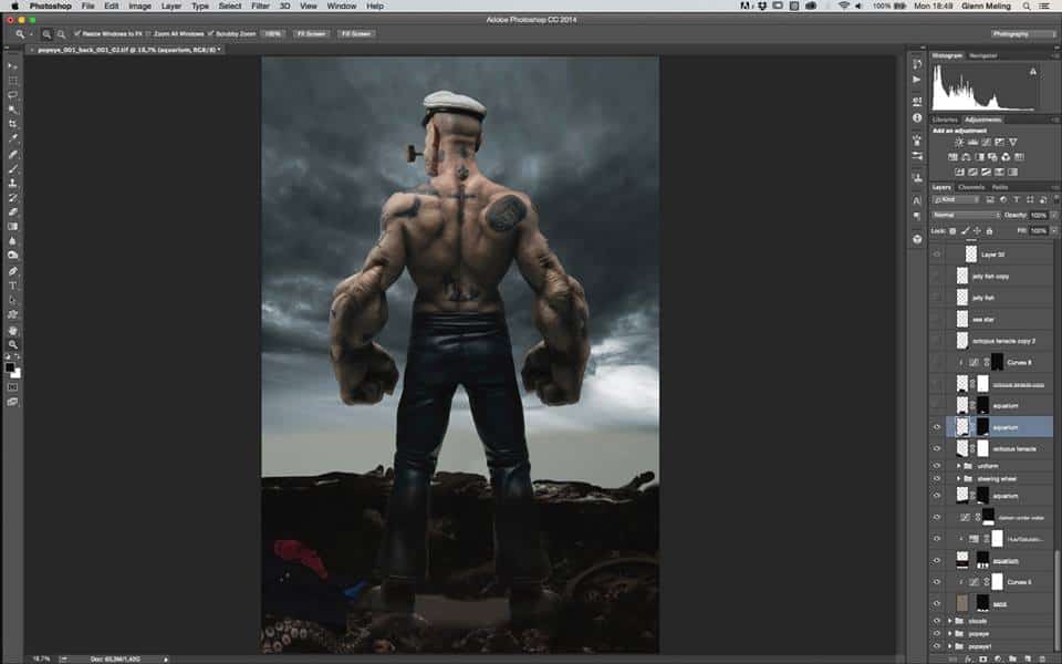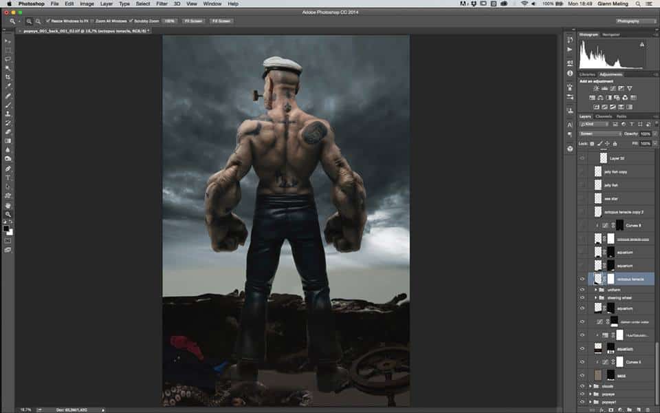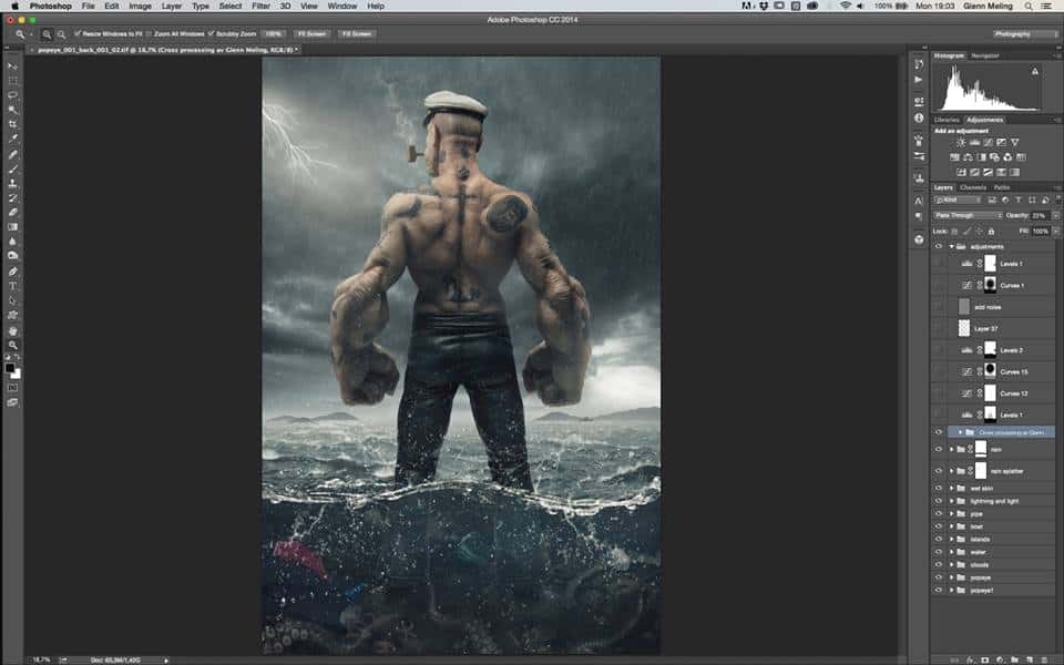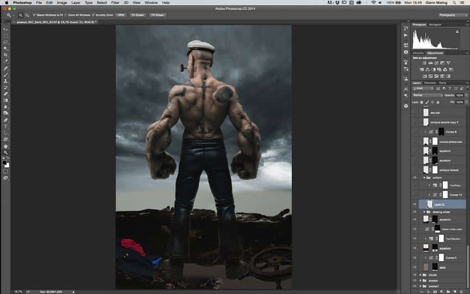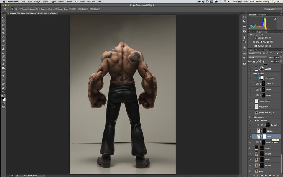 De Noorse fotograaf Glenn Meling laat op zijn Facebookpagina zien hoe hij stap voor stap een filmposter maakt. Zijn startpunt is een pop van Popeye. Door te spelen met verschillende achtergronden, creëert hij een aansprekende poster.