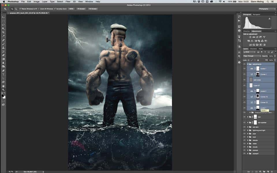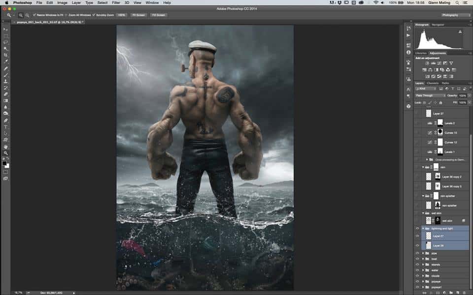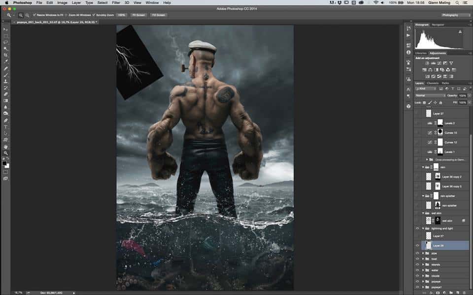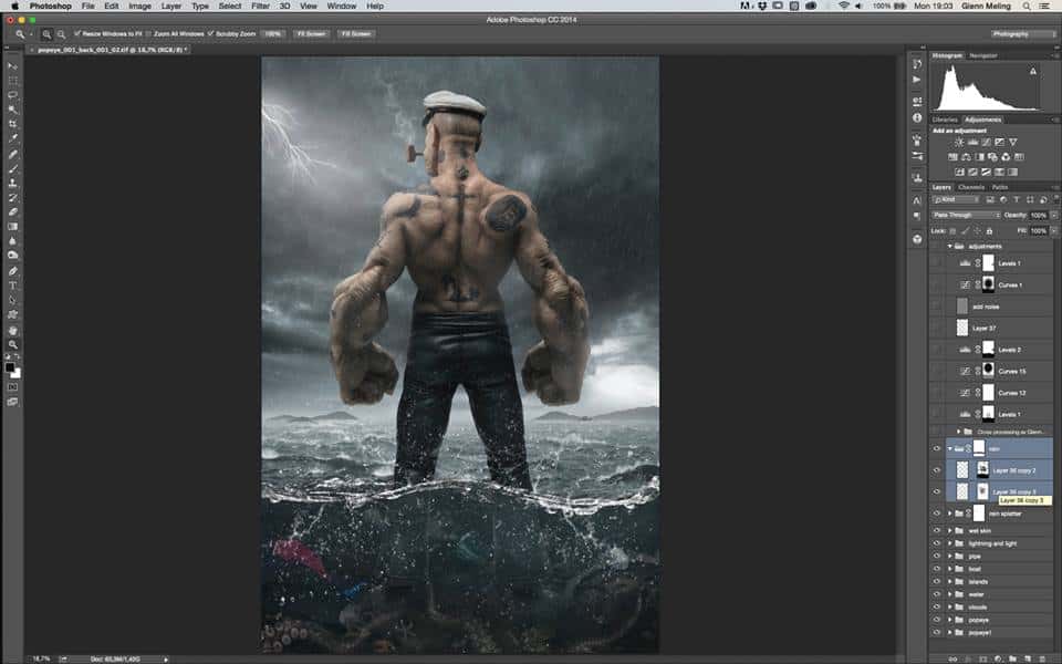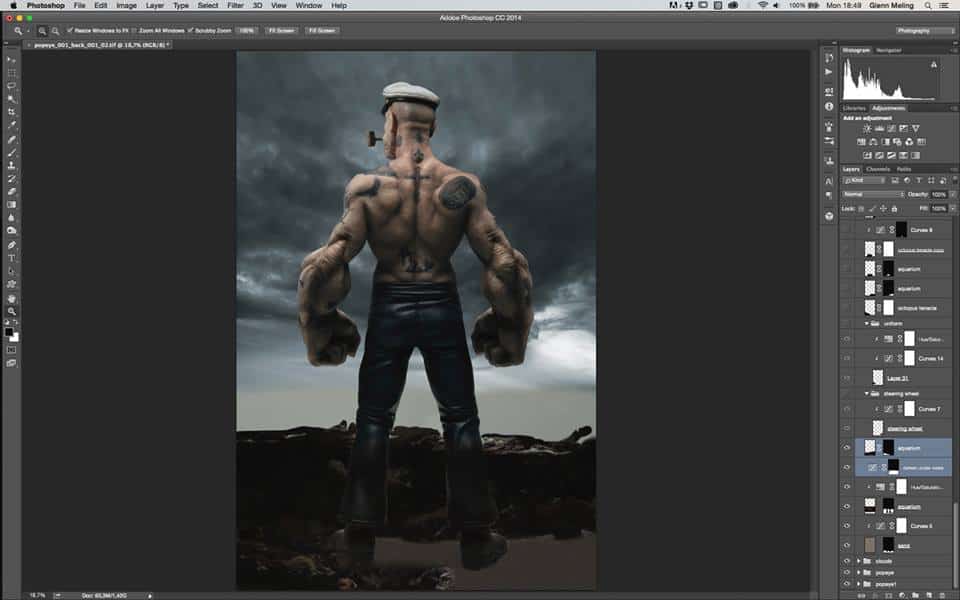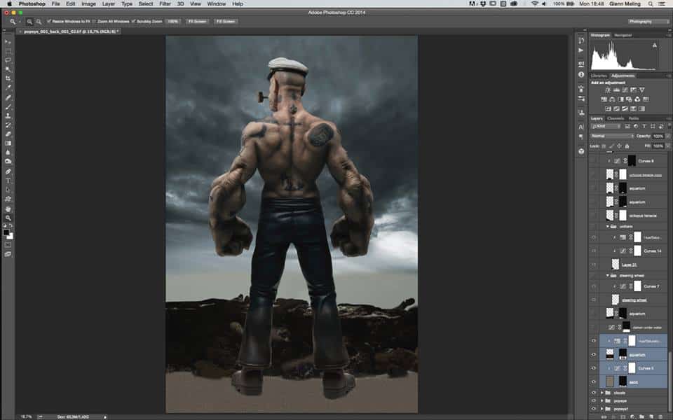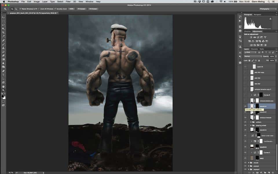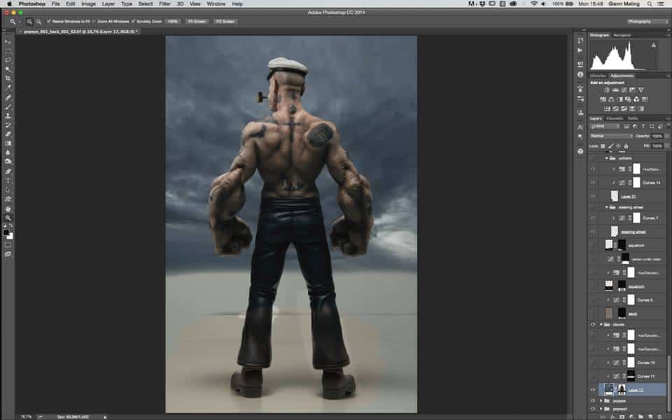 De Noorse fotograaf Glenn Meling laat op zijn Facebookpagina zien hoe hij stap voor stap een filmposter maakt. Zijn startpunt is een pop van Popeye. Door te spelen met verschillende achtergronden, creëert hij een aansprekende poster.