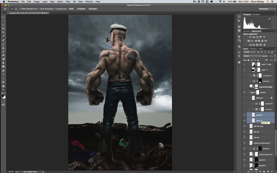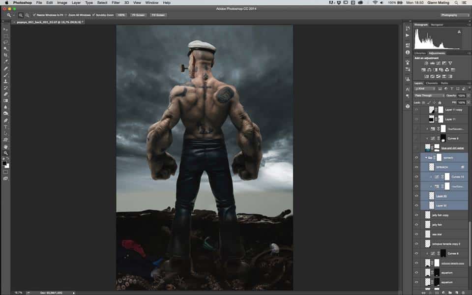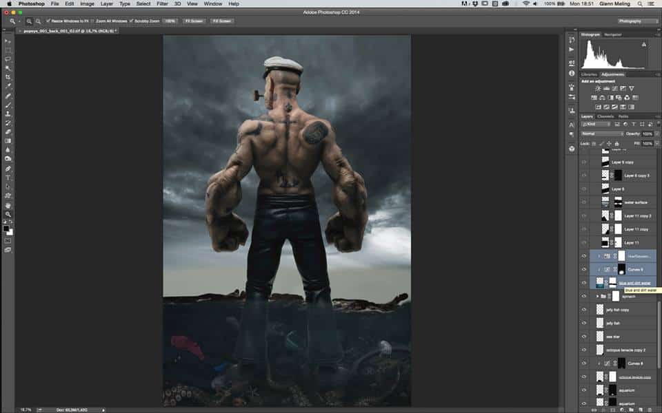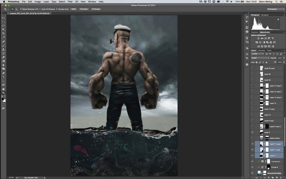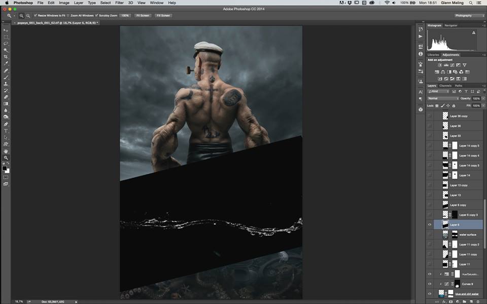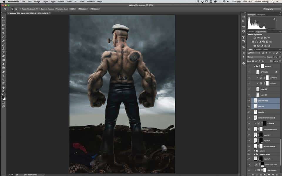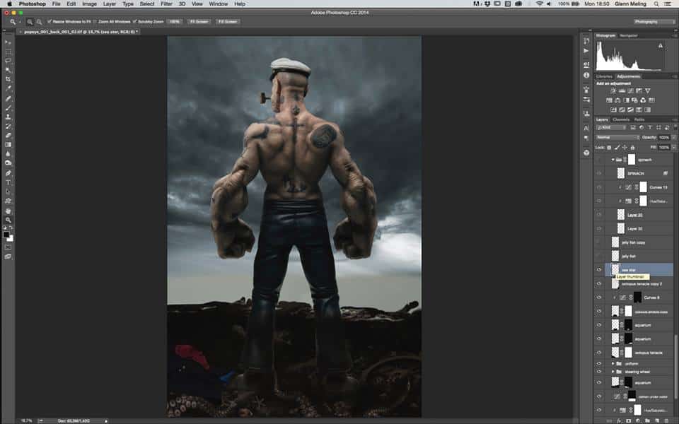 De Noor heeft drie jaar uitgetrokken om te leren werken met het bewerkingsprogramma.”In die tijd heb ik overigens niet alleen leren werken met Photoshop, ik heb ook aan mijn vaardigheden op het gebied van fotografie gewerkt. Ik wilde binnen drie jaar in staat zijn om mijn geld te kunnen verdienen met fotografie en fotobewerking. Dat was mijn belangrijkste motivatie. Daarnaast streef ik natuurlijk altijd naar nog betere foto’s.”Het idee voor de filmposter ontstond tijdens het experimenteren met een pop van Popeye. “Ik was de pop aan het fotograferen met mijn iPhone, om te kijken hoe het eruit zag. Toen ik de pop van achter fotografeerde , kwam het idee naar boven. Dat zou er cool uitzien als filmposter! Daarnaast wilde ik al drie jaar iets doen met een beeld waarbij je iets boven en onder water ziet. Die wens heb ik bij dit project meegenomen. Ik heb het ontwerp voor de poster eerst ‘uitgetekend’ in mijn hoofd en ben toen met Photoshop aan de gang gegaan. Een vriend bedacht om een pot spinazie toe te voegen.”