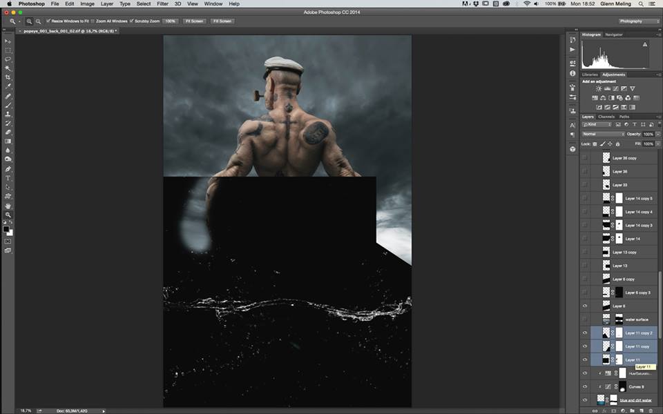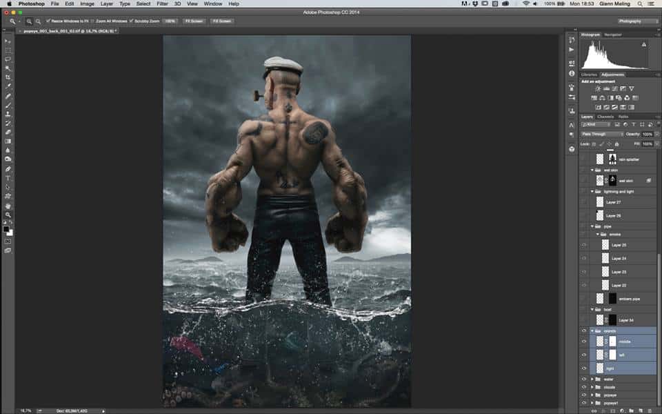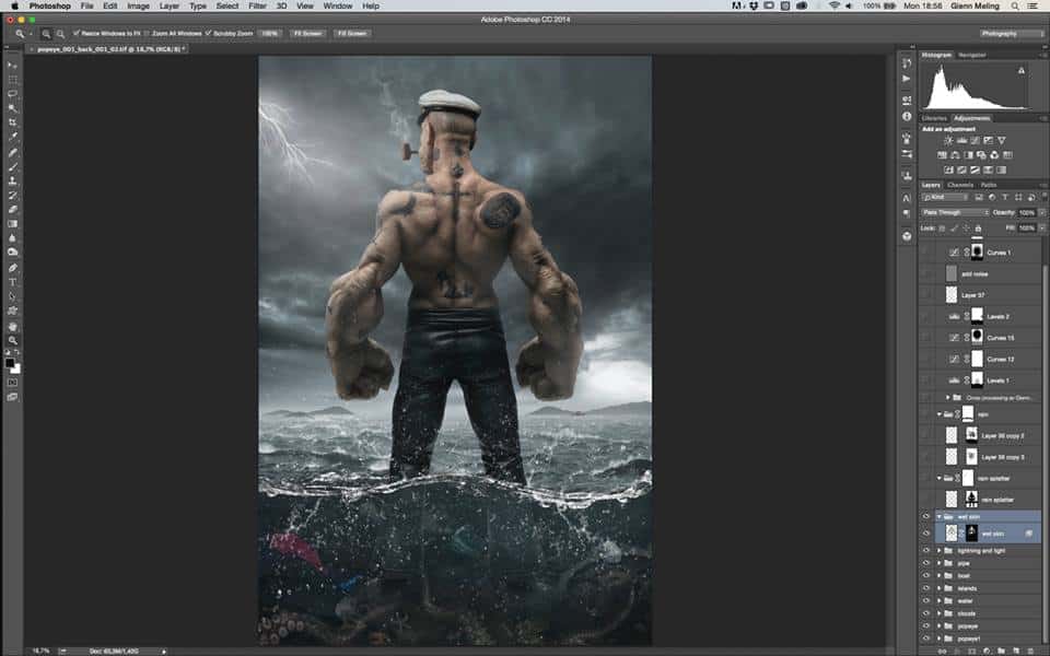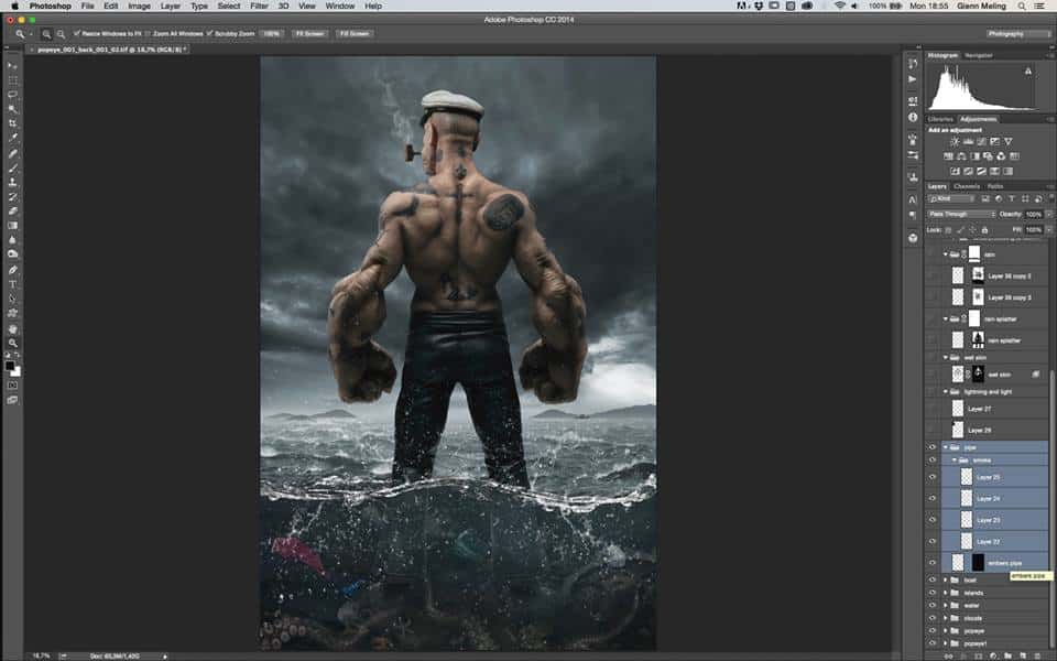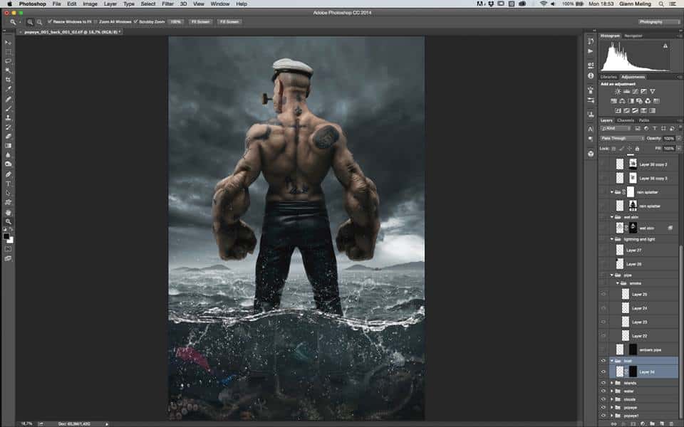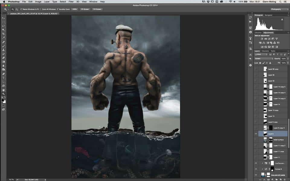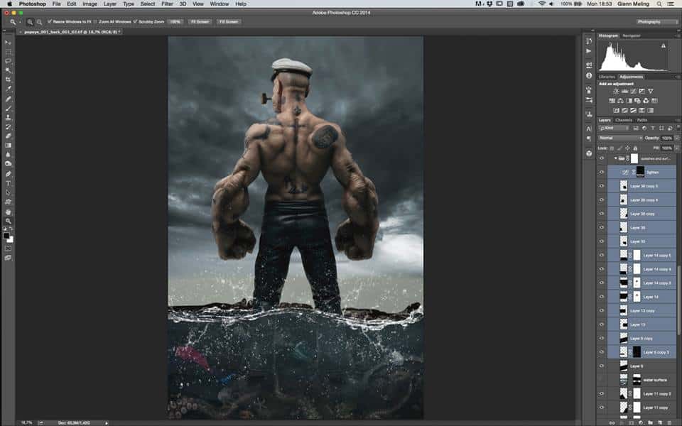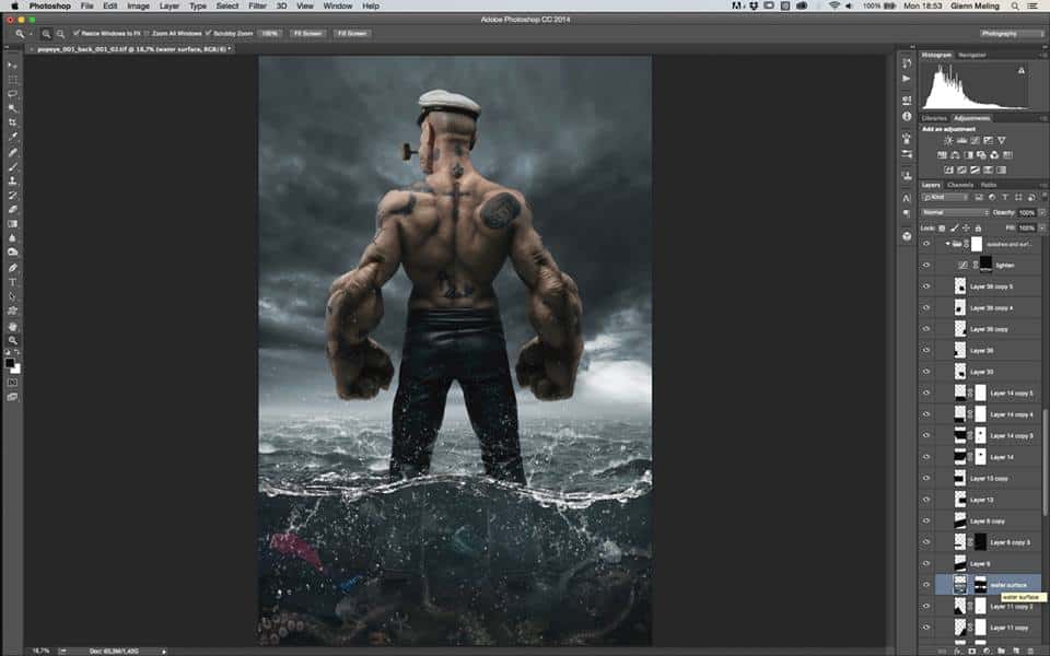 De Noor heeft drie jaar uitgetrokken om te leren werken met het bewerkingsprogramma.”In die tijd heb ik overigens niet alleen leren werken met Photoshop, ik heb ook aan mijn vaardigheden op het gebied van fotografie gewerkt. Ik wilde binnen drie jaar in staat zijn om mijn geld te kunnen verdienen met fotografie en fotobewerking. Dat was mijn belangrijkste motivatie. Daarnaast streef ik natuurlijk altijd naar nog betere foto’s.”Het idee voor de filmposter ontstond tijdens het experimenteren met een pop van Popeye. “Ik was de pop aan het fotograferen met mijn iPhone, om te kijken hoe het eruit zag. Toen ik de pop van achter fotografeerde , kwam het idee naar boven. Dat zou er cool uitzien als filmposter! Daarnaast wilde ik al drie jaar iets doen met een beeld waarbij je iets boven en onder water ziet. Die wens heb ik bij dit project meegenomen. Ik heb het ontwerp voor de poster eerst ‘uitgetekend’ in mijn hoofd en ben toen met Photoshop aan de gang gegaan. Een vriend bedacht om een pot spinazie toe te voegen.”