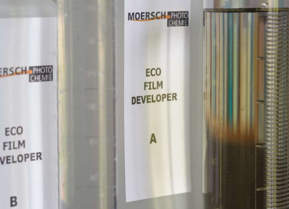 Bij mijn bescheiden zoektocht naar de spullen die ik nodig had stuitte ik op de Moersch ECO ontwikkelaar, die de beide problemen in één keer oplost. De ontwikkelaar wordt in twee concentraten geleverd, zoals gebruikelijk A en B geheten, die los van elkaar ook in de geopende flessen twee jaar houdbaar moet zijn, wat me zelfs bij een bescheiden gebruik wel voldoende lijkt. Het andere mooie is dat de gebruikte ontwikkelaar gewoon weggespoeld kan worden. Stopbad is in geen van beide opzichten een probleem en fixeer blijft lang goed, hoewel niet onbeperkt. En dat mag je niet wegspoelen, maar je hebt er kwa volume zoveel minder van nodig dat het geen probleem is die liter zo nu en dan naar het chemisch afval te brengen.