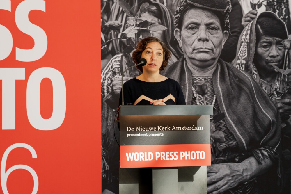 Joumana El Zein Khoury (directeur World Press Photo) geeft in een speech haar visie op de taak van de fotojournaistiek © Ton Hendriks