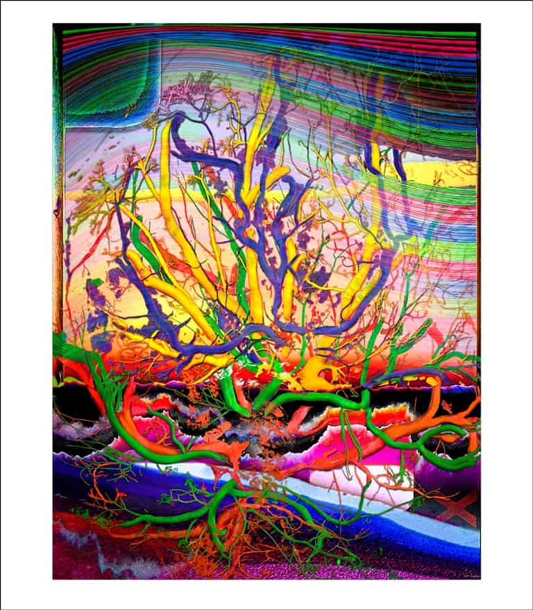 Daar richt Timmers zich nu op. Voorbeelden zie je op deze pagina. ‘Twins – the placenta as human delta’ verbeeldt tweelingenonderzoek. “De patholoog anatoom spuit hierbij na de geboorte via de navelstreng gekleurde vloeistoffen in de bloedvaten in de placenta . Zo kan gekeken worden of er verbindingen tussen de bloedbanen van de baby’s bestaan. Met in de achtergrond een not to restored signal.”