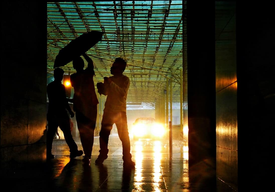 “Het licht- en schaduwspel in deze foto vind ik erg mooi. In deze foto gaan drie werklieden de strijd aan met de heftige regen. Met maar een paraplu maken ze echter geen kans tegen de sterke wind en regen.”