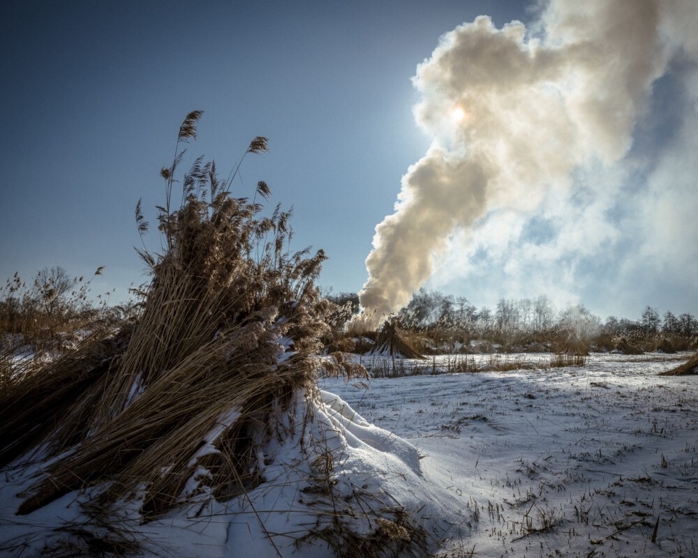 Ruben: “Toen ik vorig jaar februari een heldere dag met schaatscondities voorzag, besloot ik naar een mooi natuurgebied te gaan, het laagveen moeras Weerribben-Wieden. Als schaatsend, met de camera in mijn rugtas, zag ik kerels met hooivorken en rook. Ik werd nieuwsgierig en ging erop af. Daar trof ik vader Teun ter Meer en zoon Egbert Wolter ter Meer. Het rietsnijden zit hen in de genen. Meerdere generaties voor hen leefden ervan, naast bijvoorbeeld een beroep als boer of palingvisser. Het rietsnijden is een vorm van natuurbeheer en gebeurt tussen kerst en 1 mei. Als er niet gesneden zou worden groeit het gebied dicht en wordt het natuurgebied minder afwisselend en minder aantrekkelijk voor vogels als de roerdomp.”