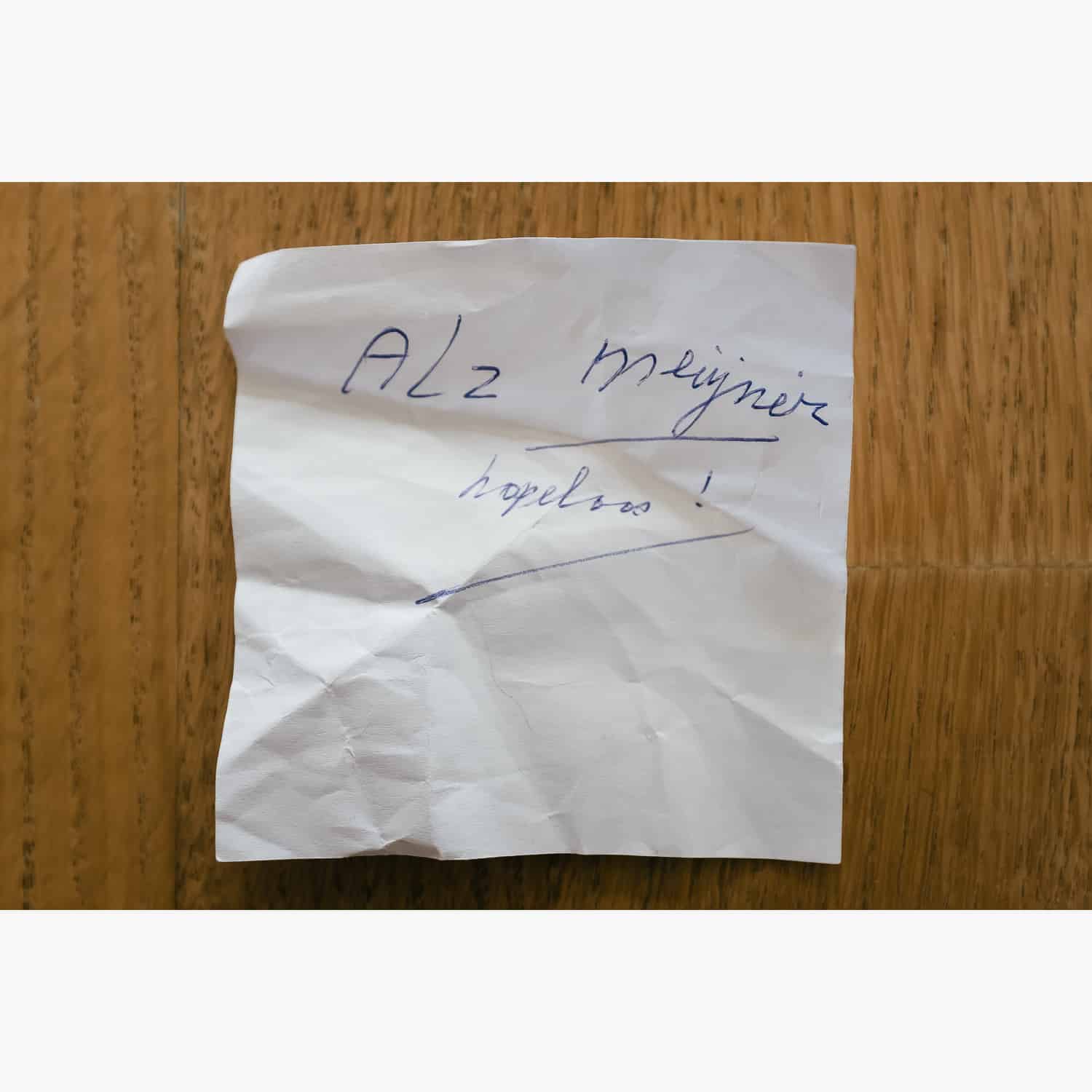 In de serie ‘ALZ Meiijner hopeloos!’ laat fotograaf Rick Stolk in kleine stillevens de gevolgen van de hersenziekte zien. Van dichtbij heeft hij het ziekteproces bij zijn schoonmoeder gevolgd. Hij kiest ervoor om niet haar, maar dagelijkse gebruiksvoorwerpen en situaties vast te leggen. Het toont de strijd van een patiënt die de greep op het leven verliest en met allerlei kunstgrepen het alledaagse leven zo behapbaar mogelijk probeert te houden.