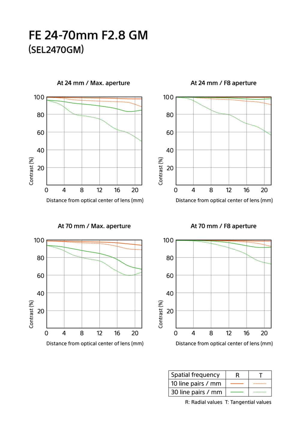 Tijdens de persintroductie werd vermeld dat de objectieven niet alleen optimaal zijn voor de huidige generatie sensoren, maar ook voor de hoge resolutie sensoren die in de toekomst uit zullen komen (!). Sony zit nu al op 42 megapixel, dus dat beloofd wat. Het betekent ook dat de eisen die aan de objectieven gesteld worden bijzonder hoog zijn. Sony onderstreept dat door de MTF-curves niet alleen bij 10 en 30 lijnenparen per millimeter vast te stellen, maar ook bij 50 lijnenparen. De curves, die net als bij vrijwel alle andere merken voortkomen uit computersimulaties en niet worden vastgesteld op basis van werkelijk geteste objectieven, zien er heel erg goed uit. Helaas zijn de curves voor 50 lijnenparen niet beschikbaar voor publicatie. Ze werden wel getoond tijdens de perspresentatie.