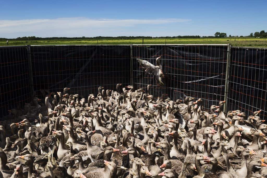 Natuur en milieu enkel: Olivier Middendorp met zijn beeld van de ganzen bij Schiphol die bijeen worden gedreven om te worden vergast. “Twee jaar geleden mocht ik alleen op afstand een foto maken. Het is me gelukt om nu dichterbij te mogen komen”, vertelt hij.