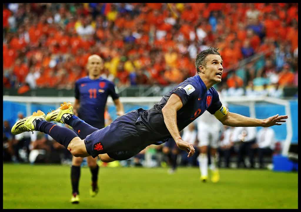 Sport enkel: Pim Ras met de kopbal van Robin van Persie. “Van dit soort beelden weet je dat ze de hele wereld overgaan. Het is kicken als je zo’n foto maakt.”