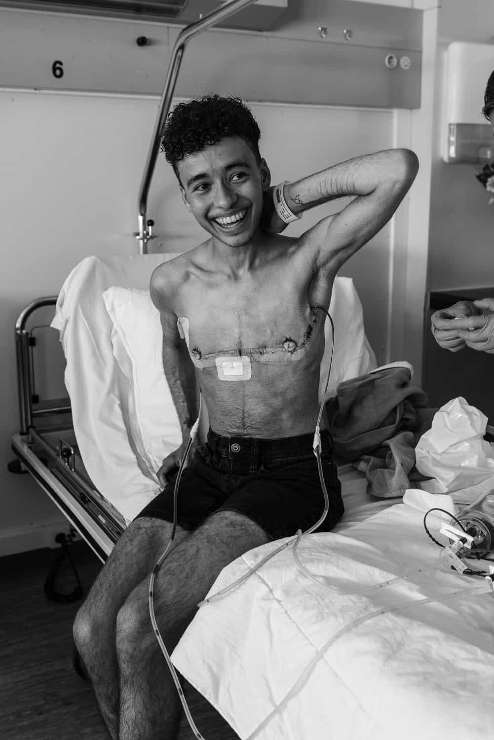 Als hij mag starten met de behandeling, is hij blij. Ook als hij ziet hoe hij verandert. Toch is het tevens lastig. “Hierdoor werd ik nog meer geconfronteerd met mijn lichaam. Voor de buitenwereld begon ik meer op een man te lijken, maar ik werd steeds banger dat mensen zouden zien dat ik borsten had.” In juli van dit jaar heeft hij een mastectomie ondergaan. “Toen ik eindelijk afscheid kon nemen van mijn binder – een hesje om borsten mee te verbergen – was ik enorm opgelucht. Het voelde als een soort wedergeboorte.”