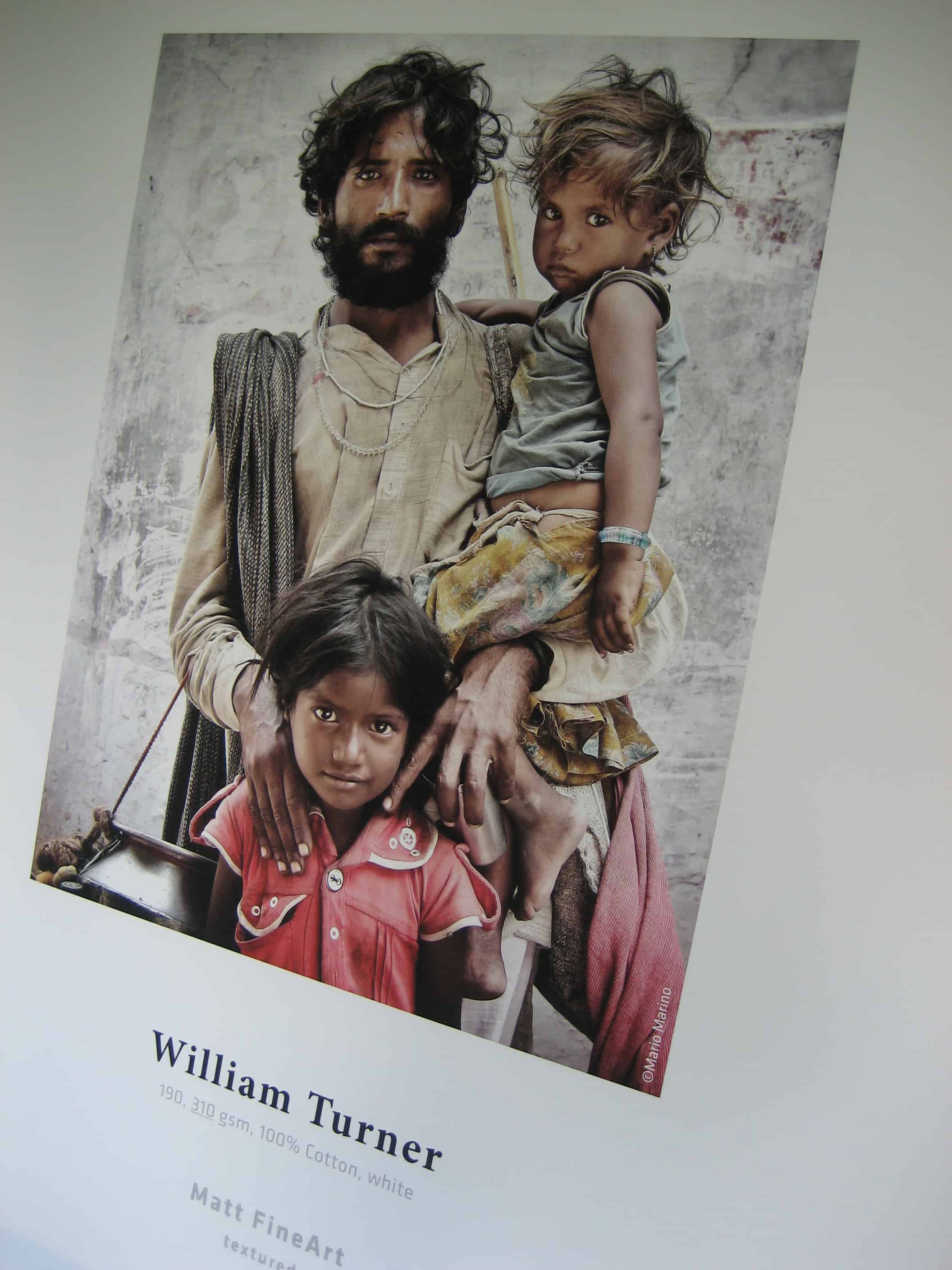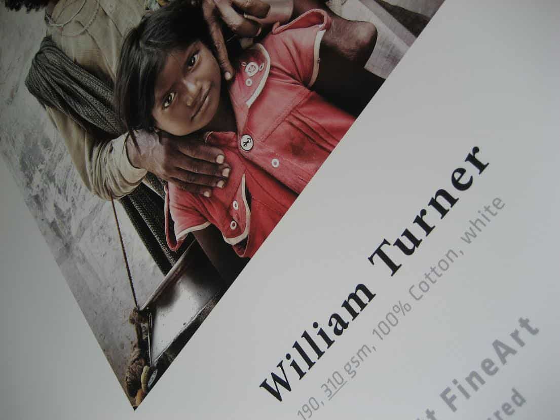 William Turner is wit en bestaat voor 100% uit katoen papier. Het geperste aquarelpapier is voorzien van een duidelijk getextureerd oppervlak. Met zijn premium matte inkjet coating voldoet William Turner aan de hoogste industrienormen met betrekking tot dichtheid, kleurbereik, kleurgradatie en beeldscherpte met behoud van de ‘touch and feel’ van echt Art Paper. Geschikt voor gebruik met gepigmenteerde en kleurstof inkjet systemen. Het papier wordt naast de gewone papierformaten tevens aangeboden in een uitvoering met geschepte randen aan vier zijden: de zogenaamde Deckle Edge William Turner.