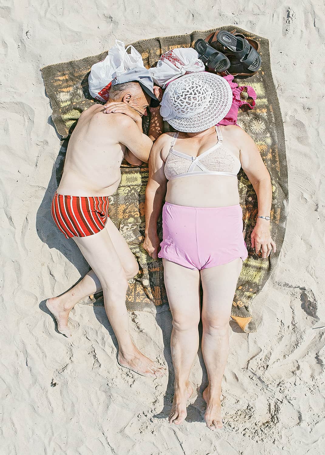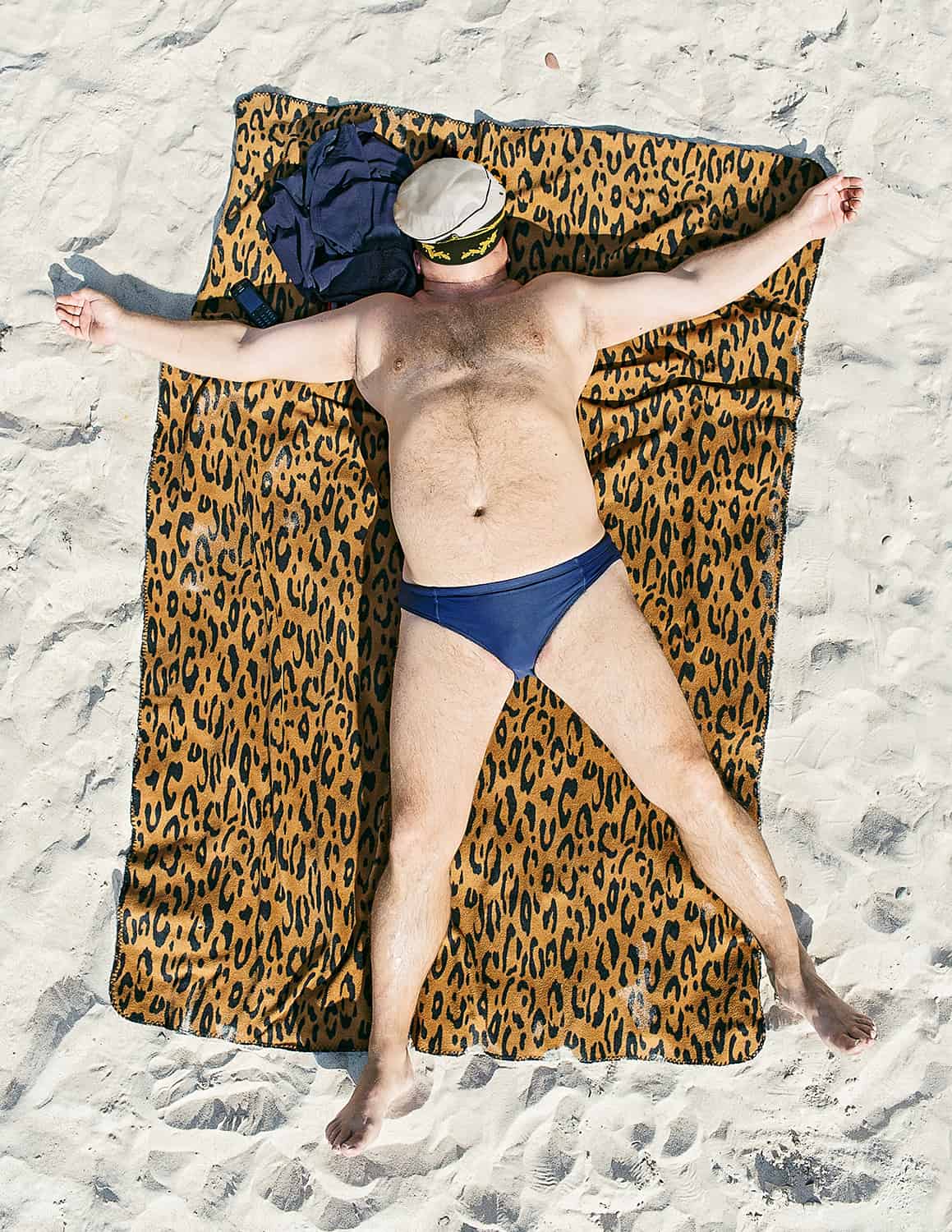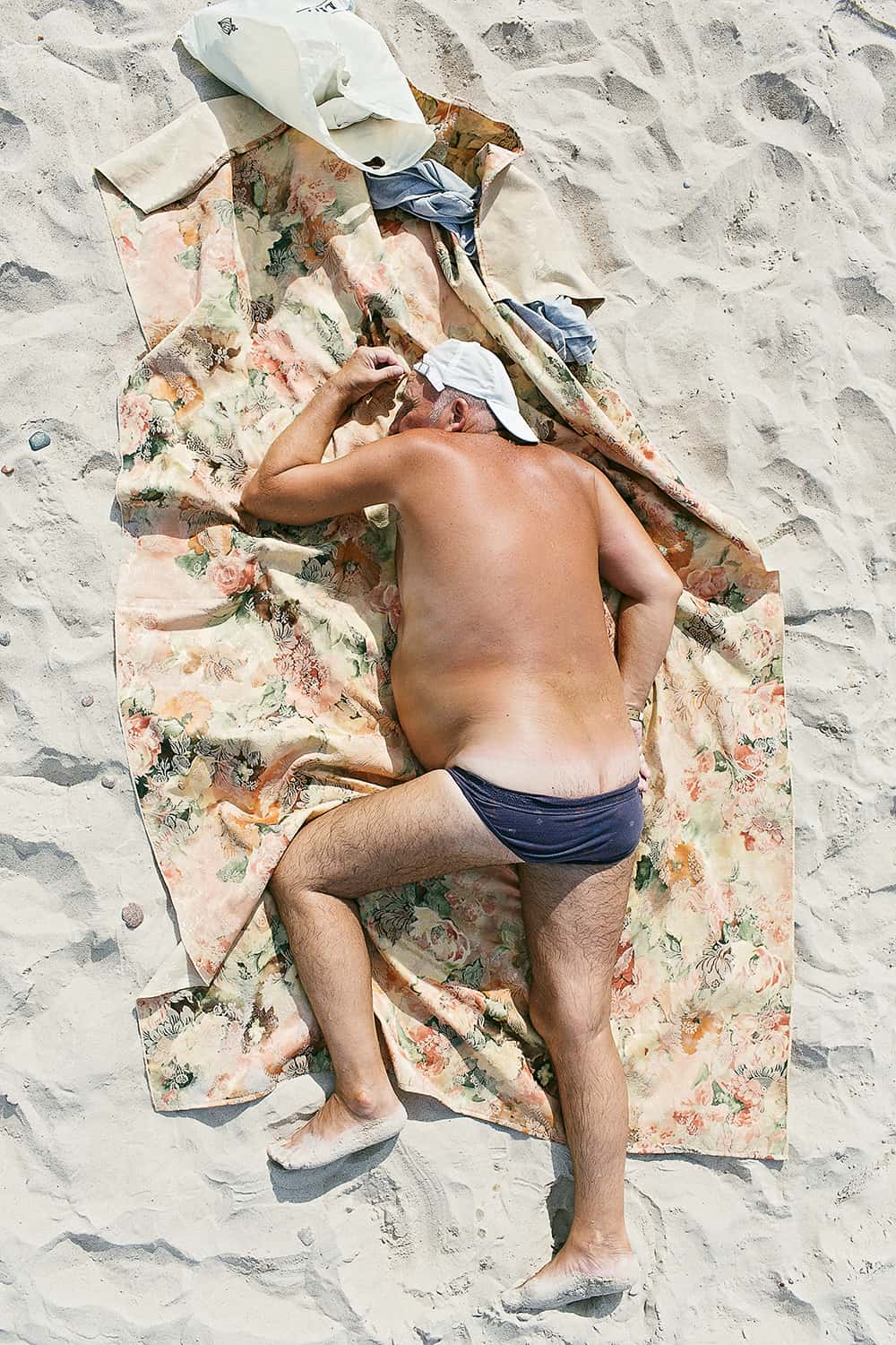 “De foto’s zijn niet in scene gezet, de mensen waren zich er niet bewust van dat ik ze heb gefotografeerd. Ik heb er voor gekozen om slapende mensen te fotograferen, omdat zij helemaal op hun gemak zijn, precies waar de titel van deze serie om draait. Dit project gaat over de kust, zonnebaden en de vrijheid die je tijdens de vakantie ervaart – waarbij je de rest van de wereld even vergeet. De gezichten van de mensen zijn niet te zien. Een bewuste keuze, want zo wordt de kijker in staat gesteld rustig te kijken en kan deze elk detail in zich opnemen, zonder afgeleid te worden. De foto’s zijn een soort type-beelden, die je ook in een encyclopedie of biologieboek zou kunnen aantreffen. Het voorkomt dat mensen empathie of een band voelen met de mensen in de foto, of zich ongemakkelijk gaan voelen. In die zin zorg ik ervoor dat de kijkers zich ook op hun gemak voelen. Het maakt immers niet uit wie de mensen op de foto zijn, het gaat erom dat we onszelf in het beeld herkennen.”