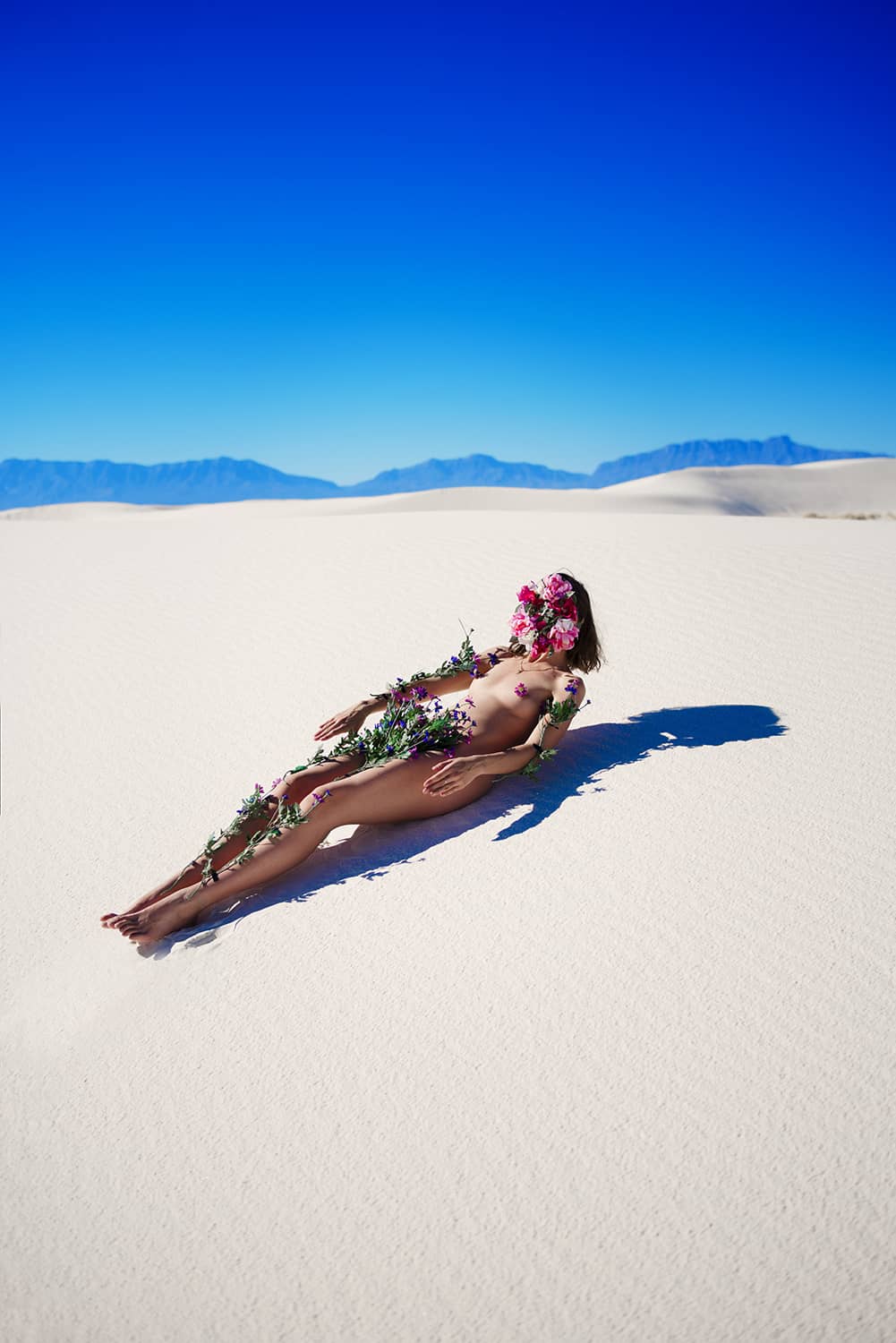 “Het grootste deel van de foto’s bestaat uit zelfportretten. Deze maak ik veelal op gevoel. Ik improviseer op locatie. Daar neem ik wel spullen mee naartoe. De kleding maak ik zelf. Soms kies ik bewust voor geen kleding of voor bodypaint. Nadeel van kleding is dat er altijd een tijdsbeleving aan vast zit, je refereert aan een bepaalde tijd. Op locatie is het een kwestie van uitproberen. Wat werkt, hoe ziet het eruit?”
